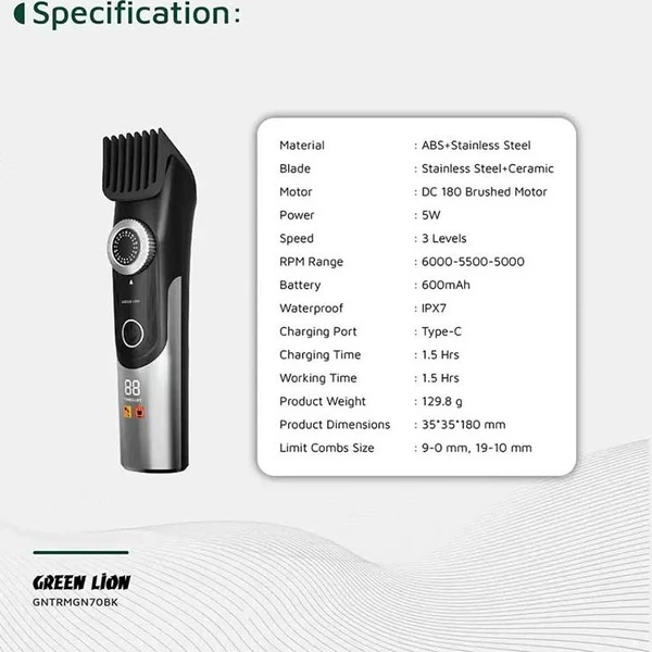 Green Lion Trim Gen'' 7 0 Body Hair Trimmer •Motor: DC 1 8 0 Brushed Motor •Blade: Stainless Steel •Ceramic •Material: ABS •Stainless Steel •RPM Range: 5 0 0 0 • 5 5 0 0 • 6 0 0 0 •Charging Time: 1 . 5 Hrs •Working Time: 1 . 5 Hrs •Charging Port: Type • C •Waterproof: IPX 7 •Battery: 6 0 0mAh •Speed Levels: 3